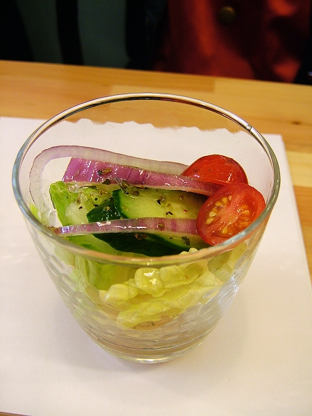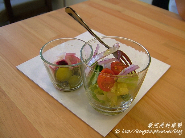 這是義大利麵套餐的沙拉,是以油醋醬為基底,味道還蠻酸的!